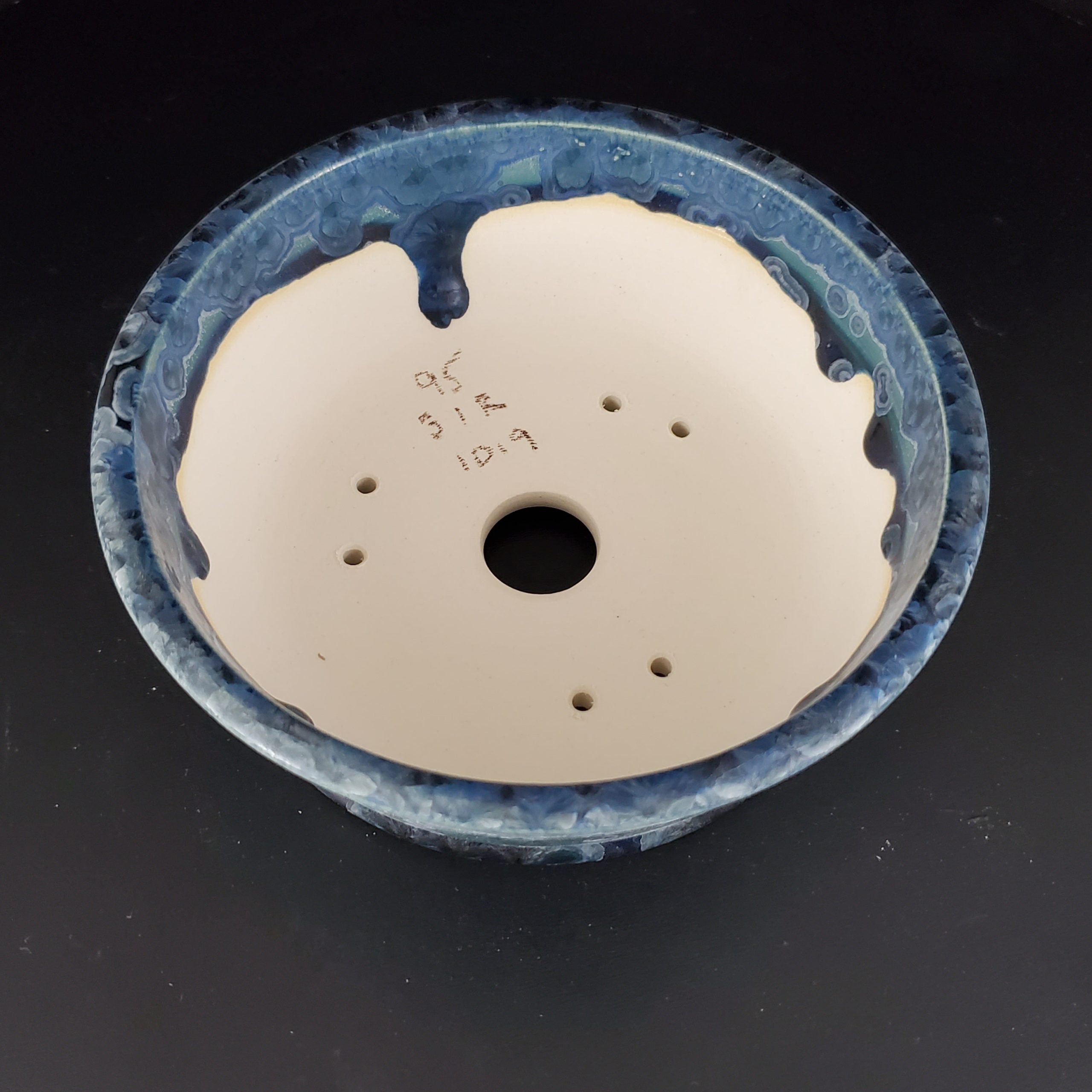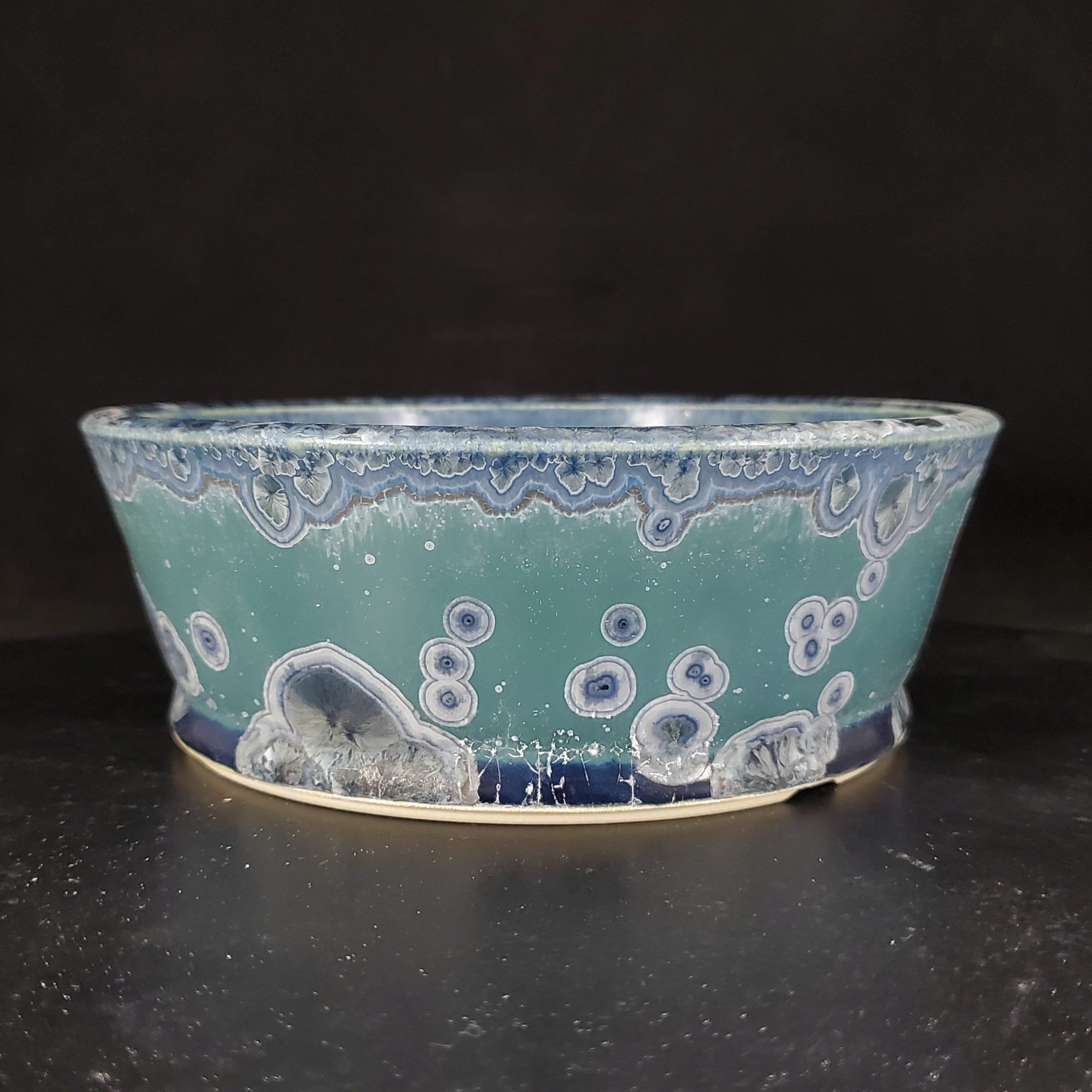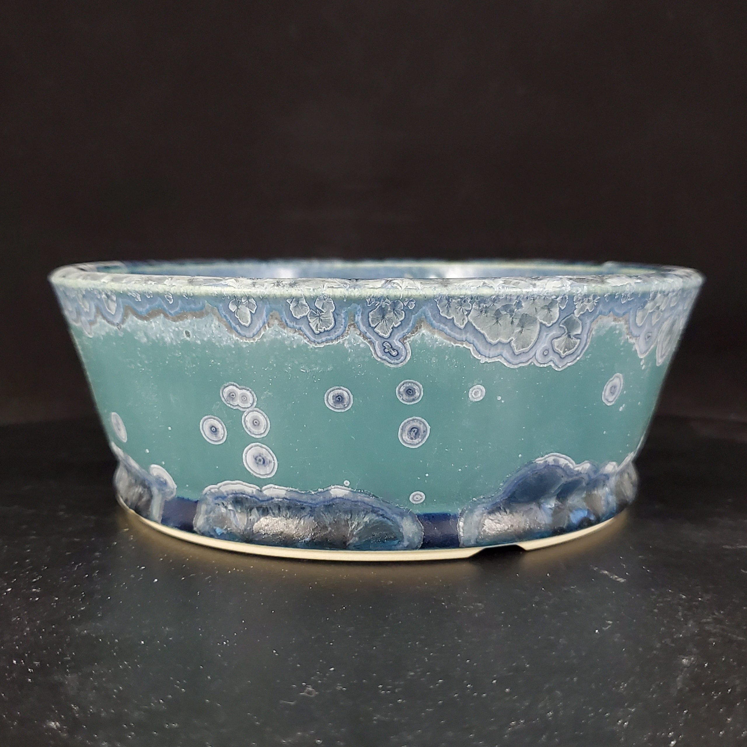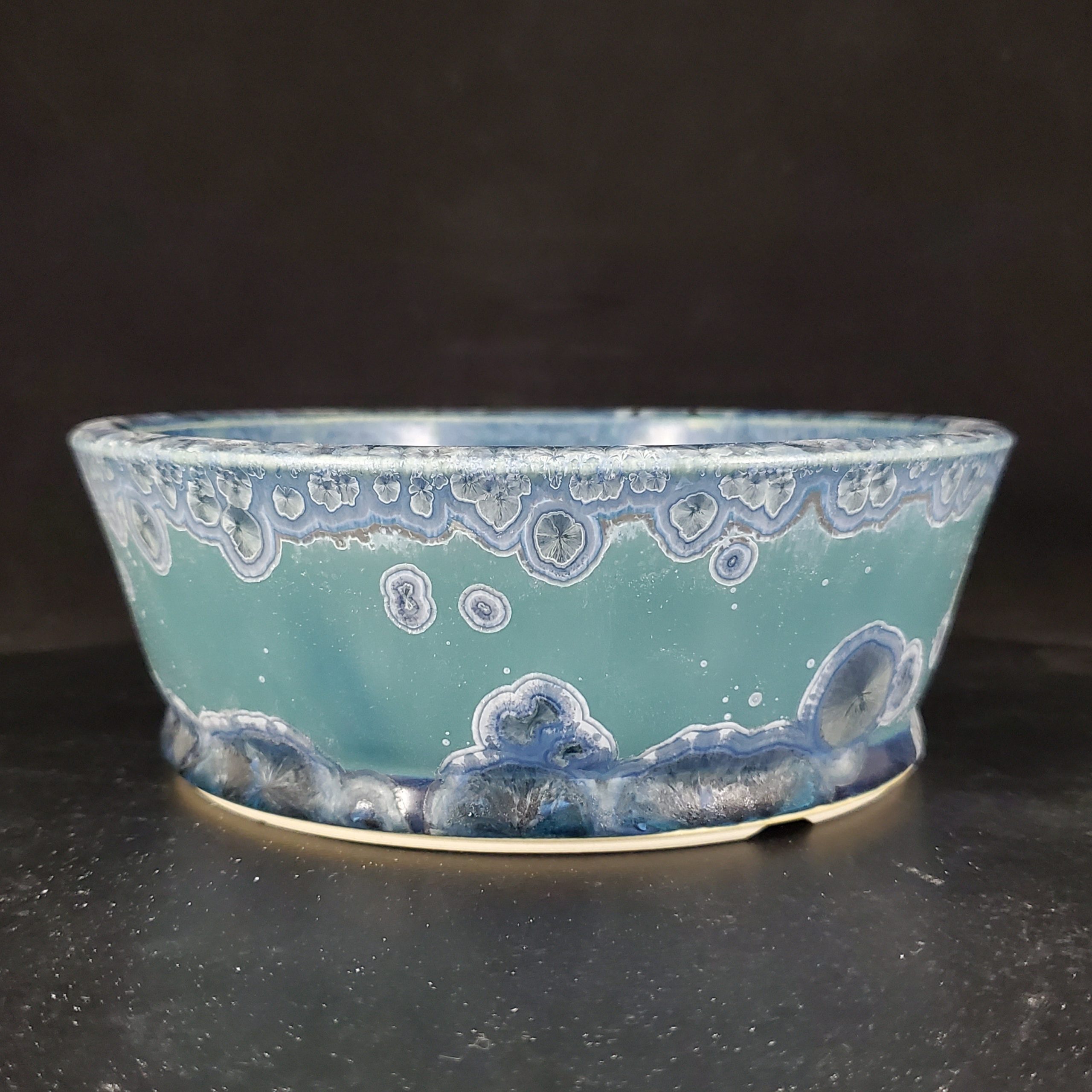 This is a medium-sized, shallow, round ceramic planter, perfect for bonsai or small decorative plants. It features a teal/turquoise base color with white and blue crystalline/patterned glazes, creating an intricate and organic design. The wide, slightly flared rim not only adds to its aesthetic appeal but also makes it easy to handle.