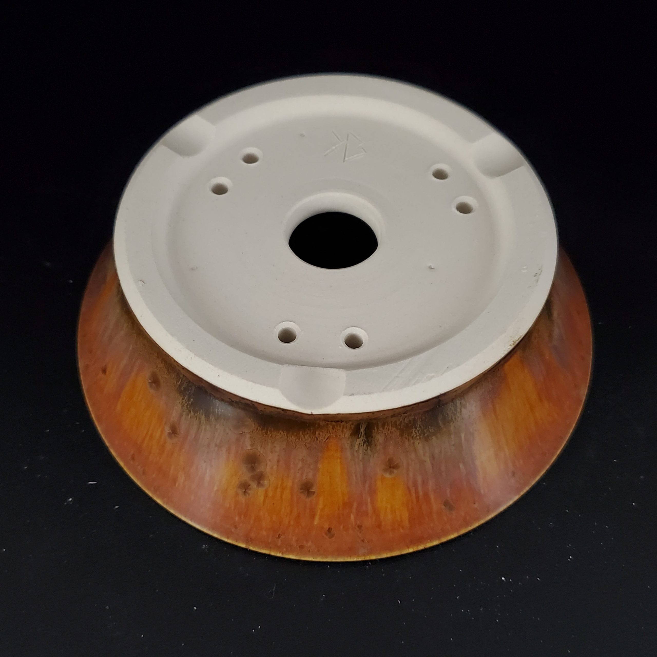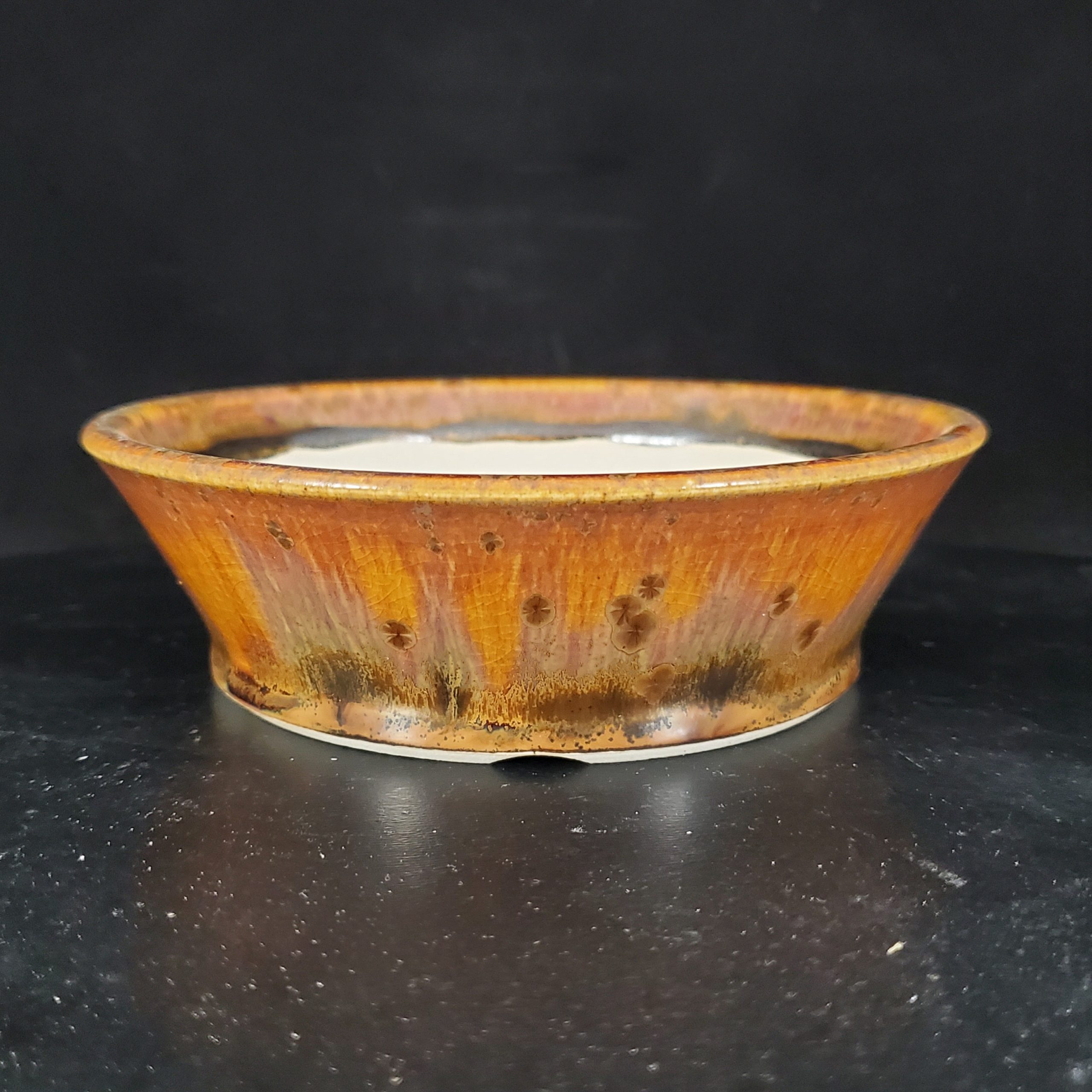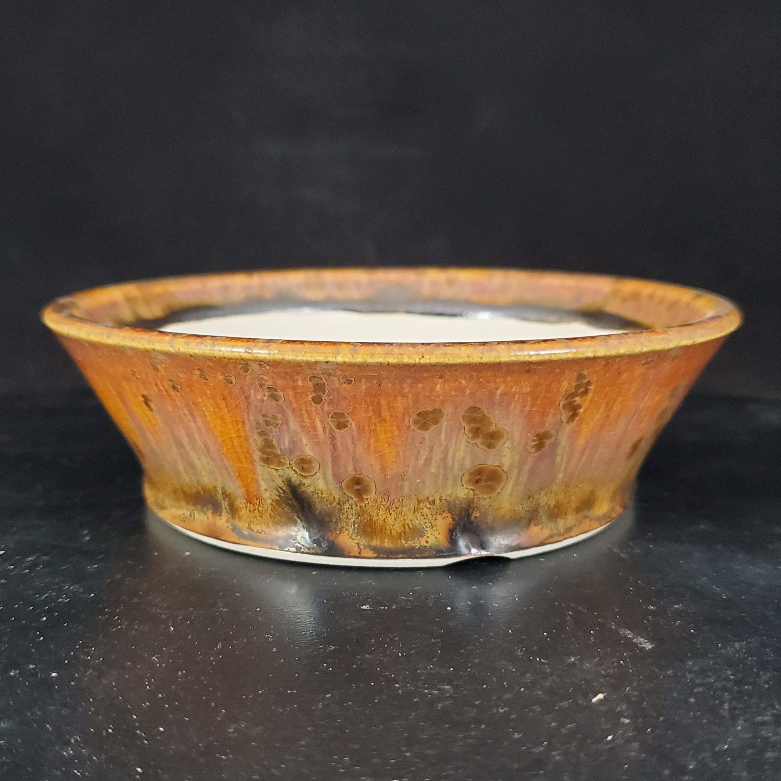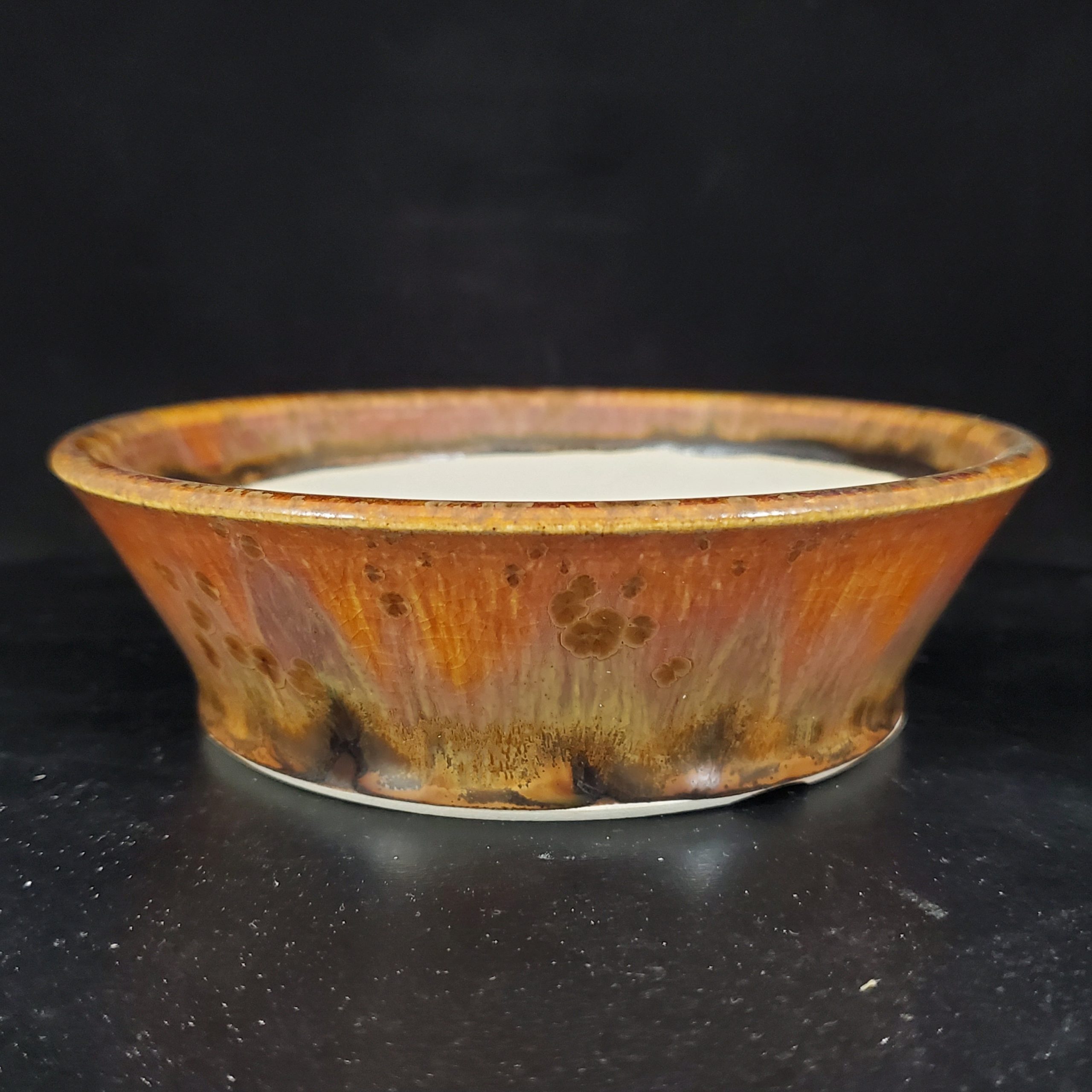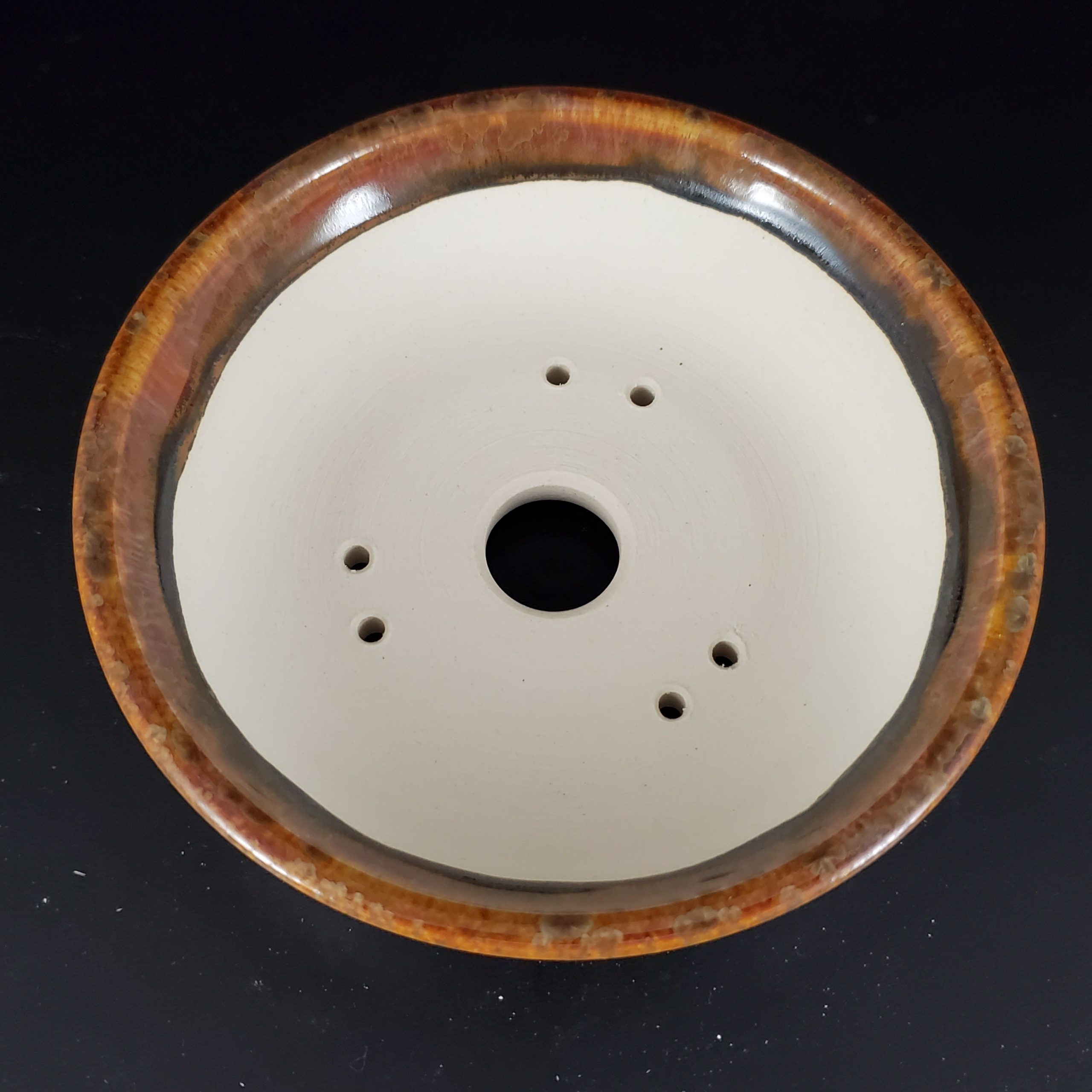 This is a handmade ceramic bonsai pot with a unique design. The exterior features a crackle – textured marbled glaze in earthy tones of orange, brown, and yellow, while the interior is a smooth, white unglazed surface. It has a shallow, wide shape with a flared rim and comes with a proper drainage system, making it ideal for small plants.