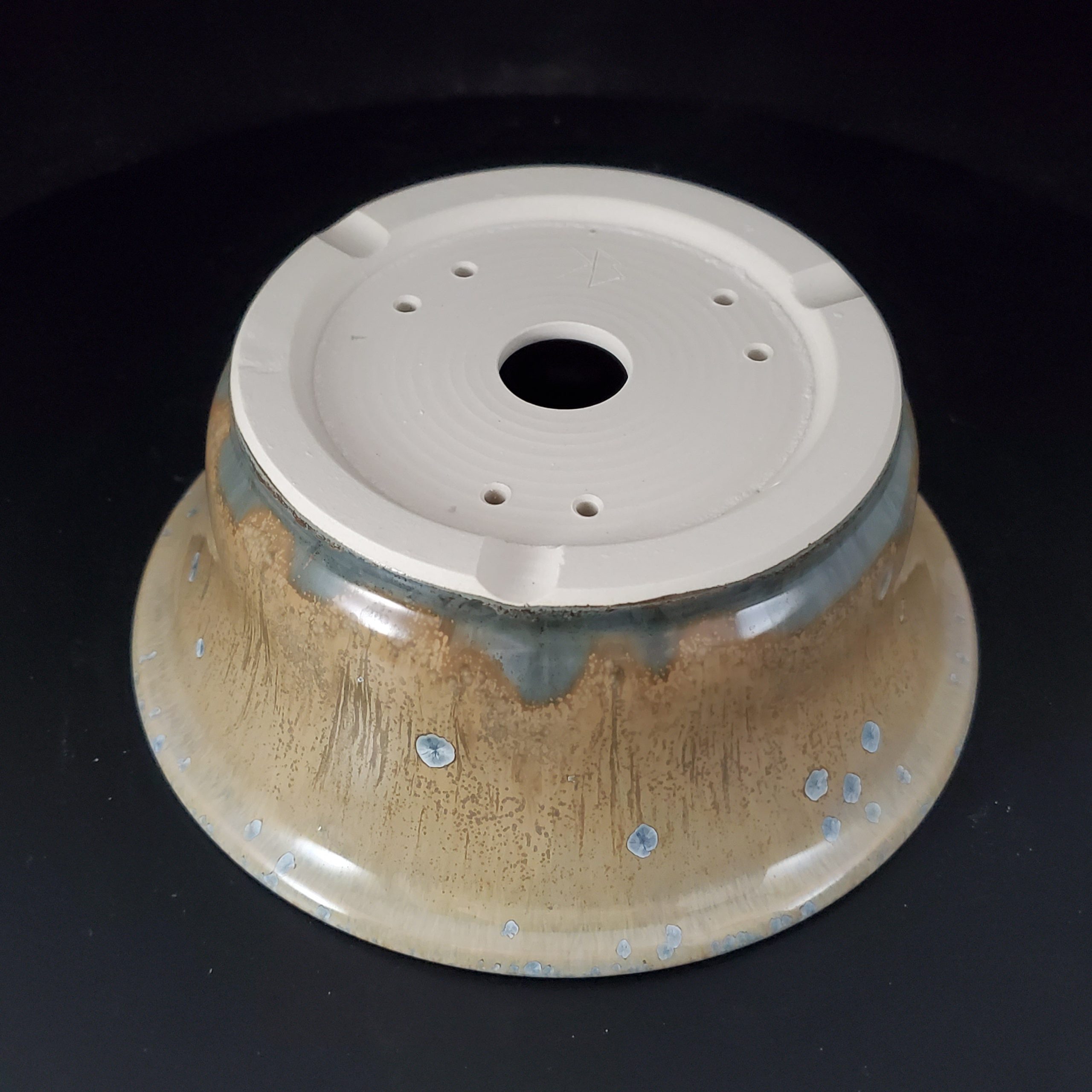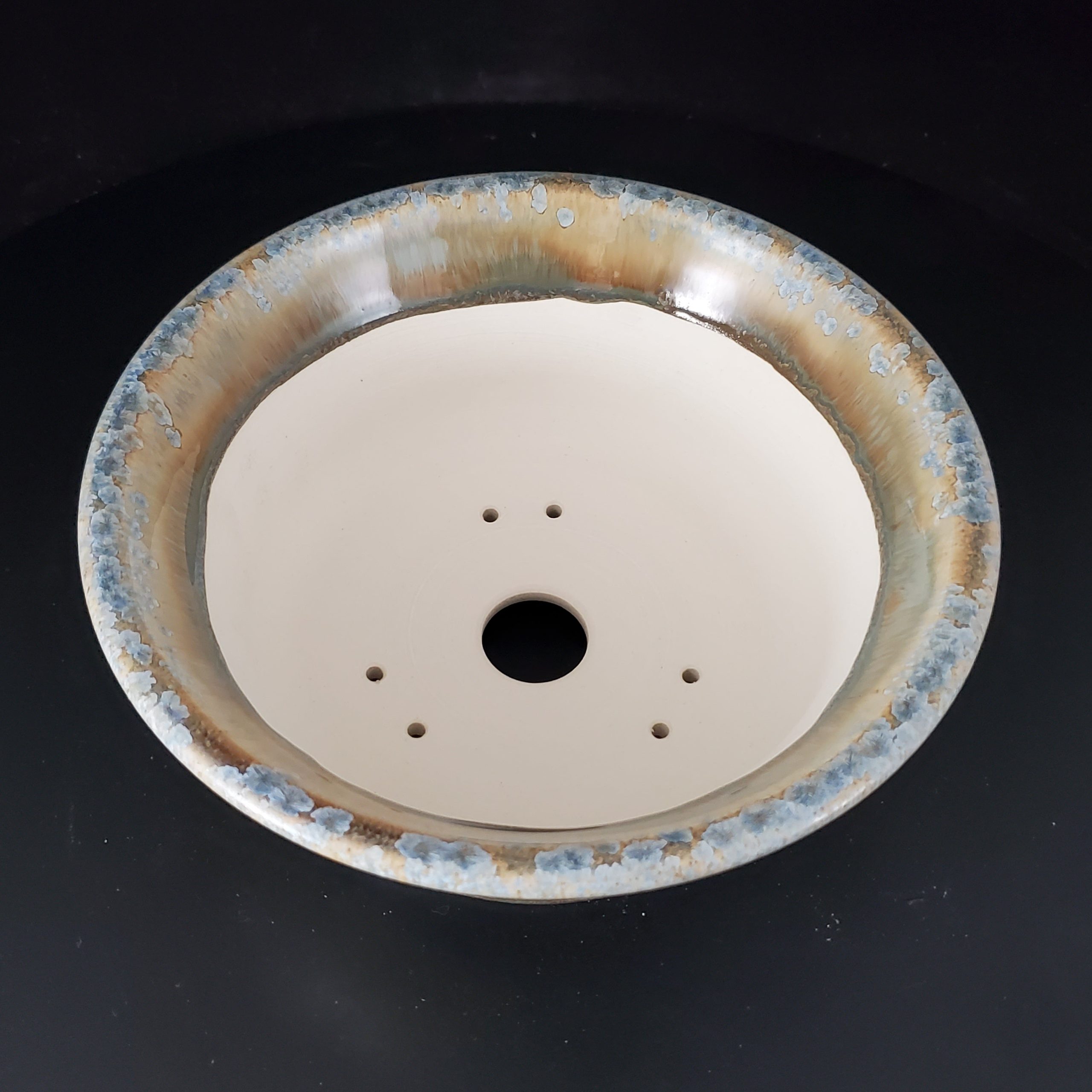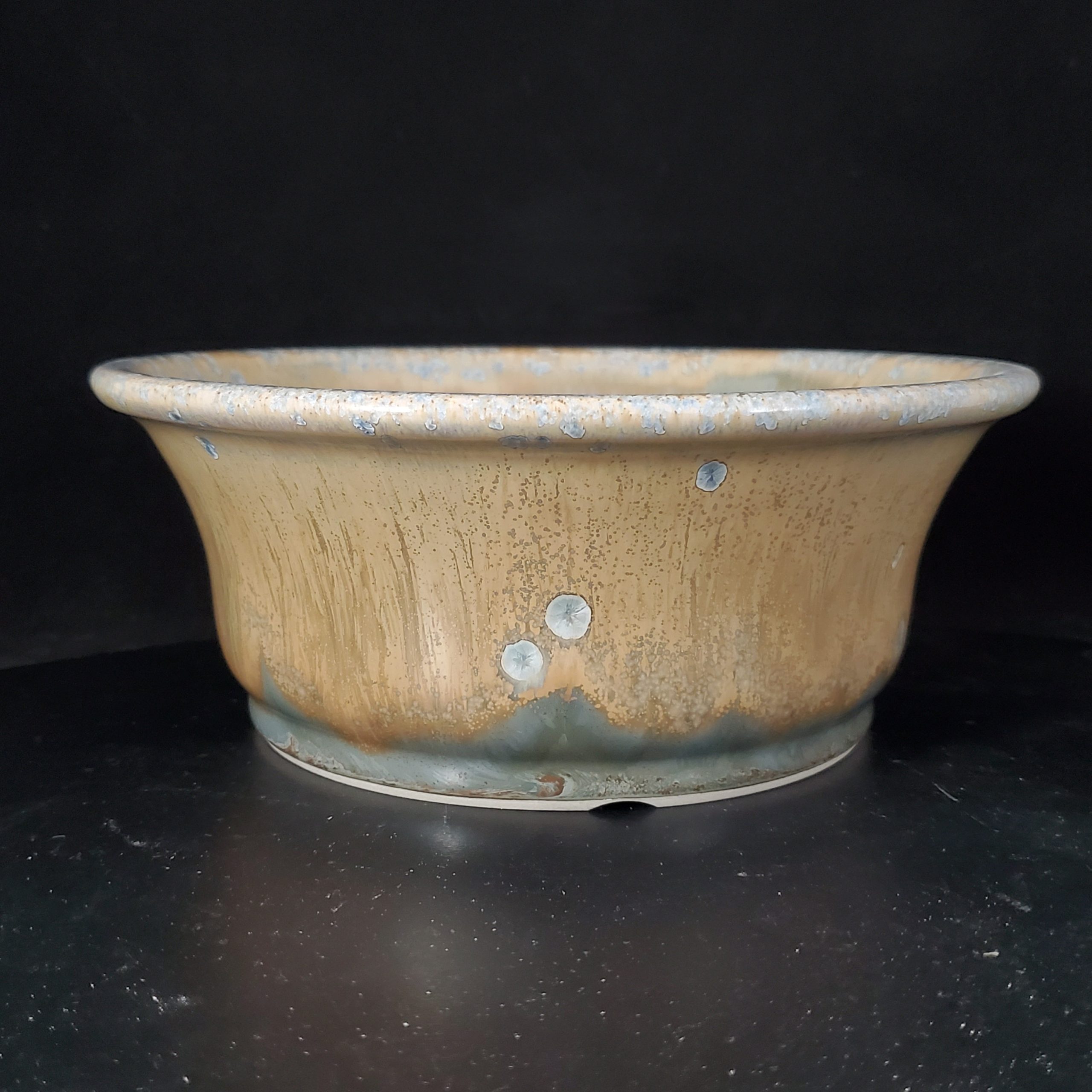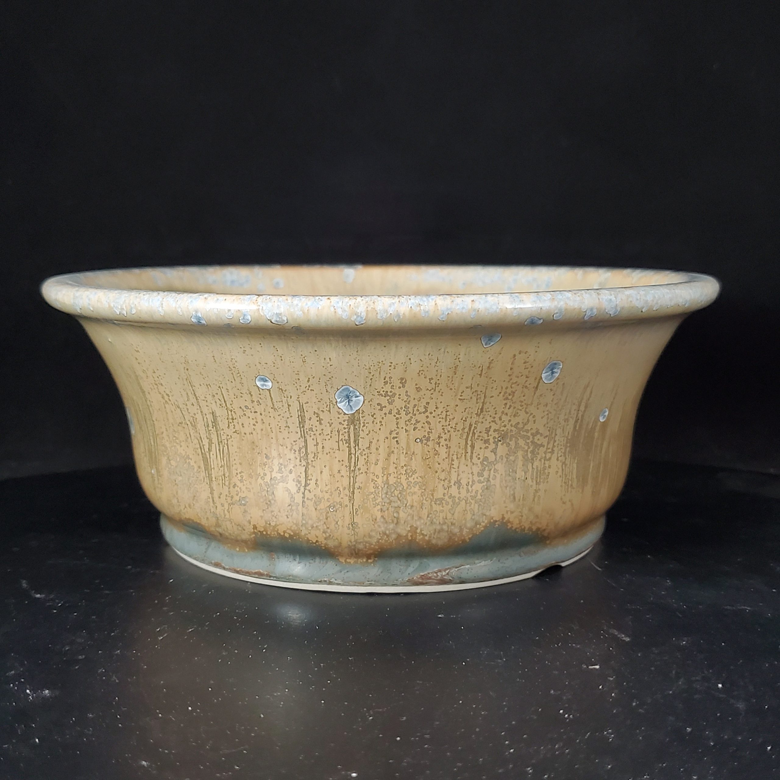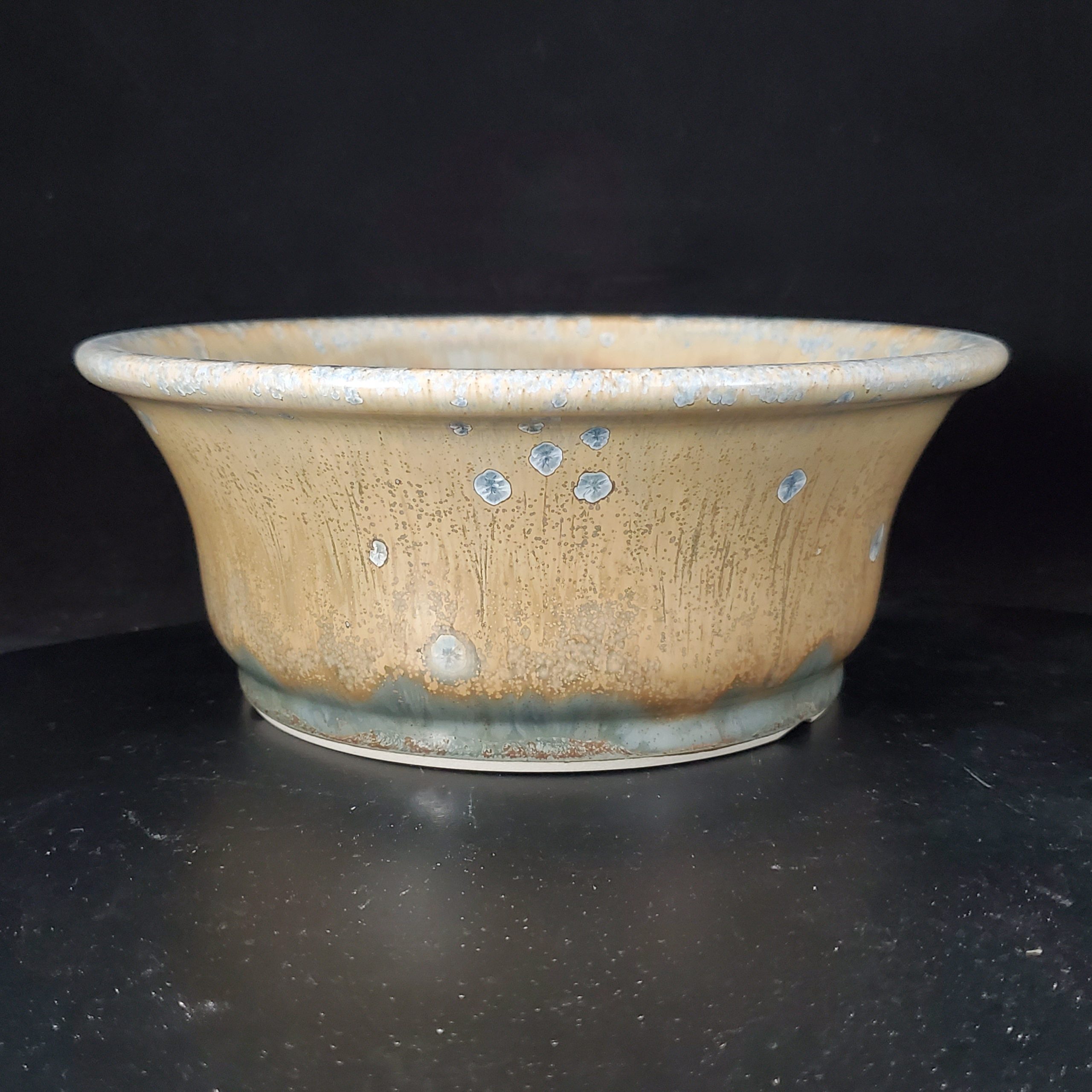 This ceramic planter, likely a bonsai pot, is a beautiful blend of art and functionality. It features a warm earthy beige – tan base with blue/gray starburst – like spots, giving it a natural and organic look. The flared – rim and shallow bowl design, along with proper drainage holes, make it perfect for growing various plants.