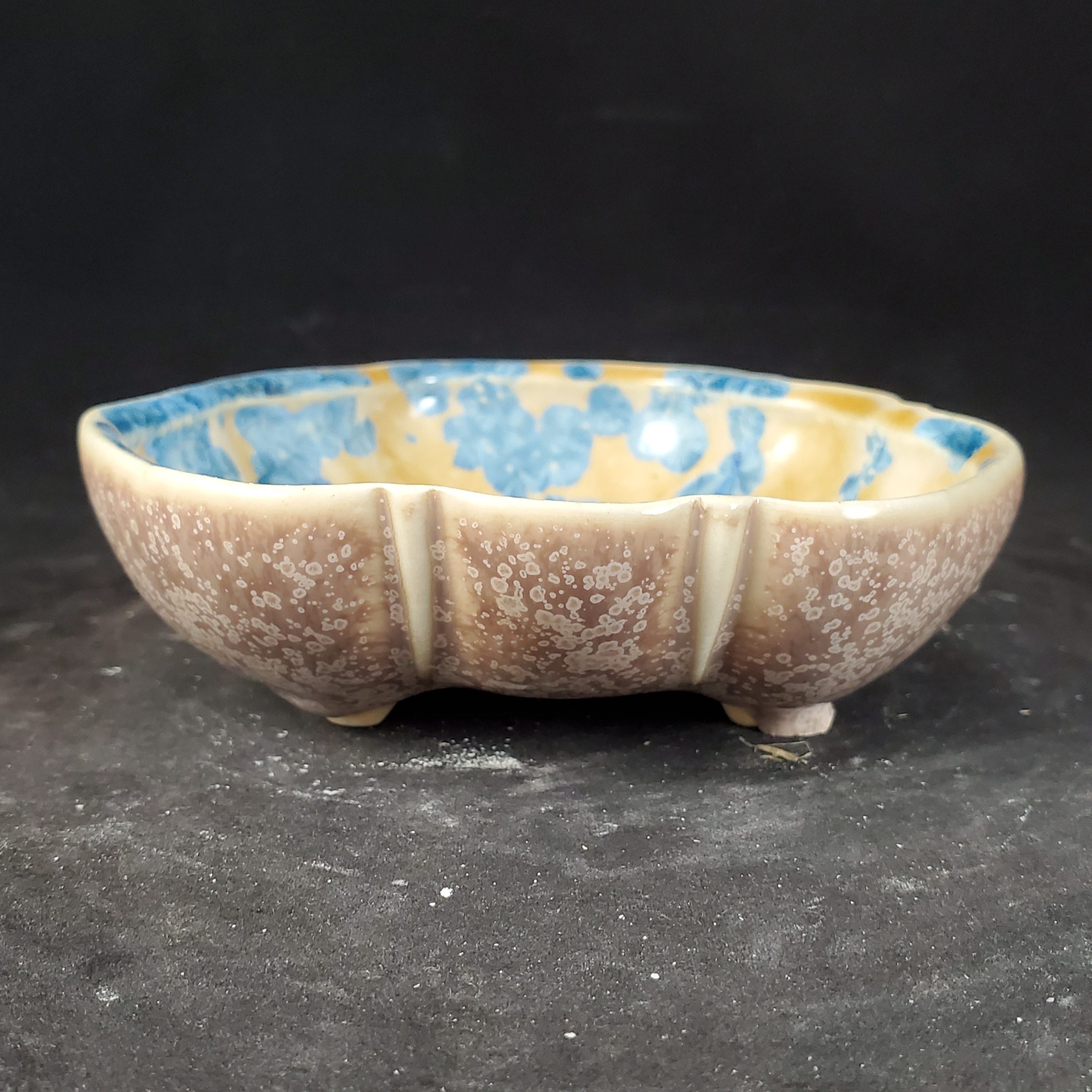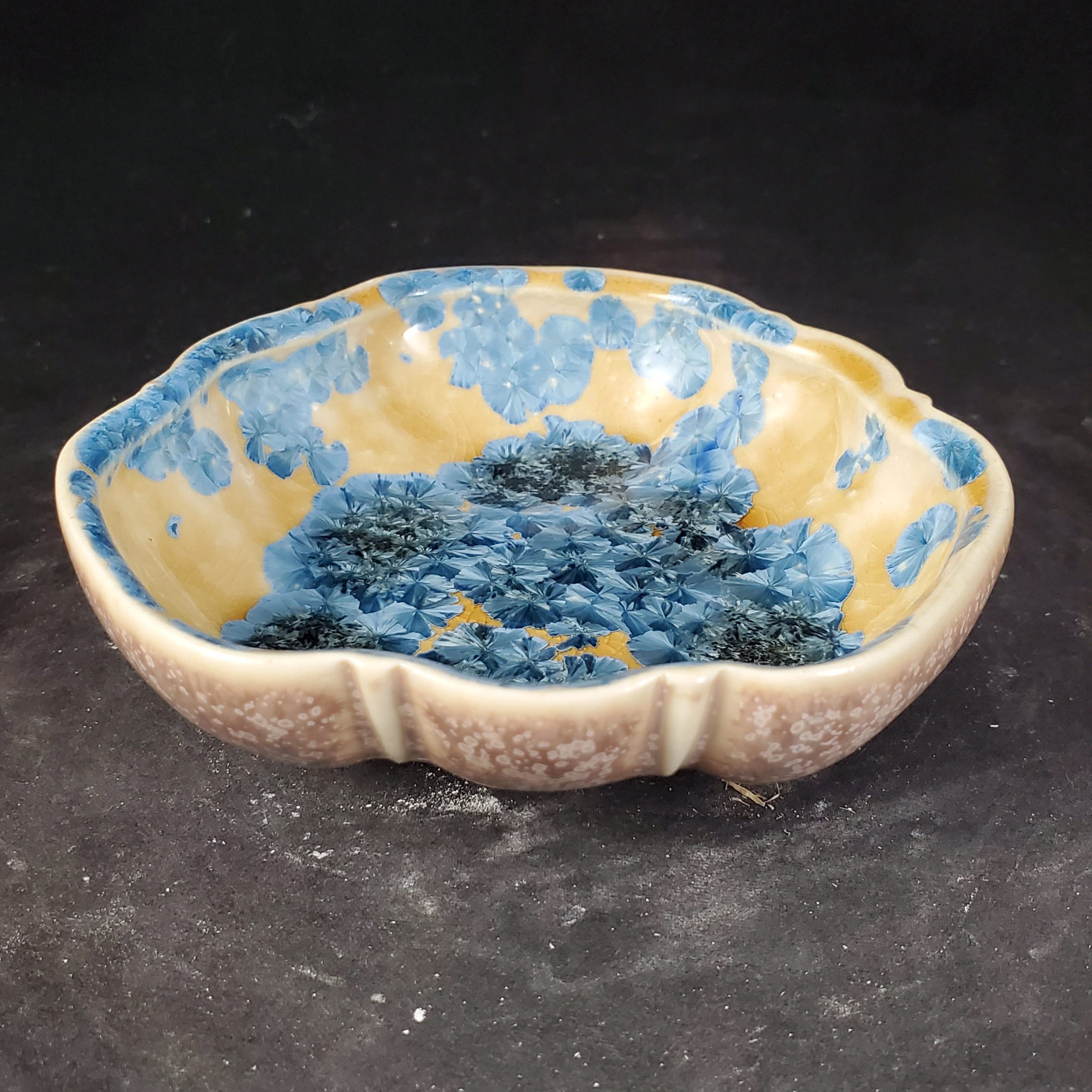This is a charming scalloped footed ceramic dish, handmade with care. It features a unique crystalline glaze, with a light yellow/cream interior adorned with a blue crystalline pattern and a muted brown/taupe exterior with white speckles. The scalloped rim and footed base add to its aesthetic appeal and functionality.